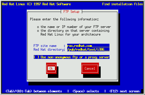 /pub/mirrors/redhat/i386/RedHat, enter /pub/mirrors/redhat/i386. If you are not using anonymous FTP, or if you need to use a proxy FTP server (if you're behind a firewall, for example), check the check box, and another dialog box will request the FTP account and proxy information.