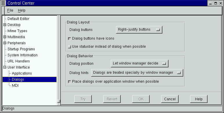 Dialog position - This will let you choose how the dialogs appear when launched. You can let the window manager decide for you (or how you have defined it in the window manager configuration), center the dialogs on the screen, or drop them where the mouse pointer is when they are launched.