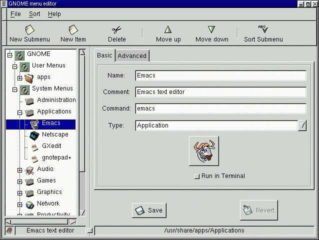 The Main Menu is a repository for your applications and can be found on the Panel. The Main Menu is preloaded with GNOME but is can be configured to fit your work habits. The Main Menu is broken up into two main subdirectories: the System menus and the User menus. The Menu Editor is available for you to add new applications to the Main Menu but you can not add applications to the System menus if you are not system administrator (root). In this section you will learn how to configure the Main Menu with applications you wish to use everyday.