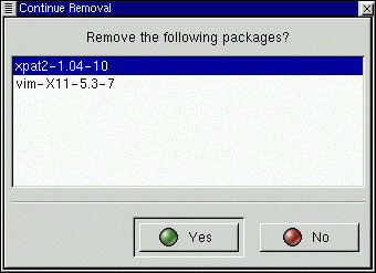 If uninstalling a package would break "dependencies," a dialog will appear, asking you to confirm the deletion. This will occur if you haven't selected the "No dependency checks" box from the Preferences menu (as shown in Figure 6-8).