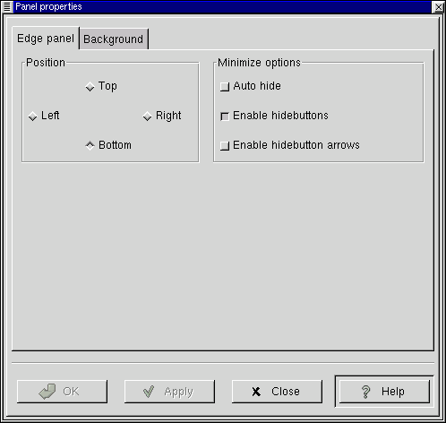 This will bring up the Panel properties dialog box. In this box you can change the properties for the active Panel.